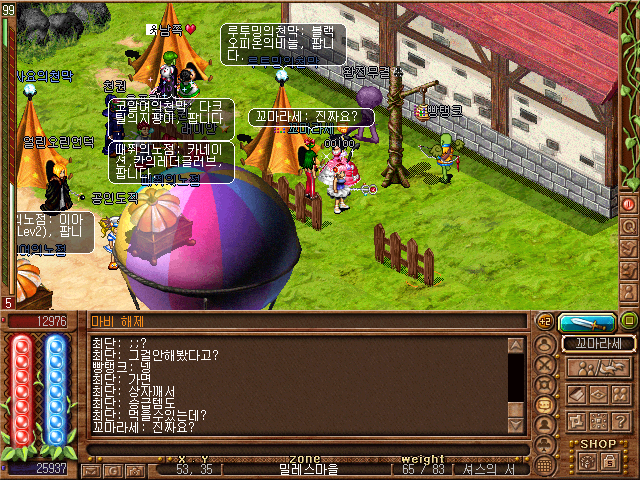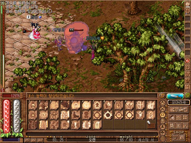 사실 도움을 받게 된 계기는 거의 텅 빈 밀레스마을에서 콩을 소환하며 놀고 있던 엠마왓슨님을 보게 된 것이 계기였던것 같습니다! 무기가 없어서 콩도 제대로 패지 못했던 저였던지라... 그리고 뿔탱크님이 그런 엠마왓슨님을 보고 따라서 콩을 소환하더라고요! 순식간에 콩밭이 되어버린 밀레스마을... 보고 있을 시간이 없어서 저는 재빨리 지하수로 몬스터에게 블레스 마법을 사용하고 경험치를 먹으러 갔습니다!