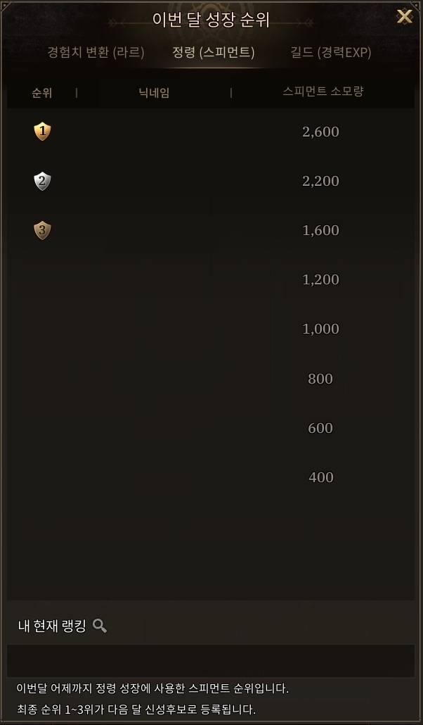 * 지난 한 달 동안 정령 성장에 스피먼트를 많이 사용한 모험가 1~3위