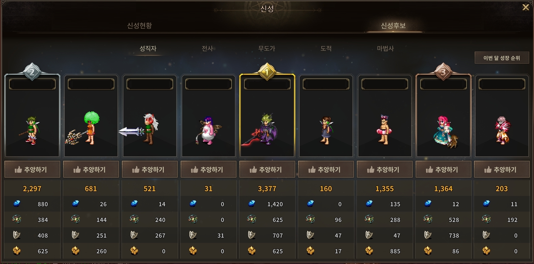 - 후보를 제외한 모험가들은 하루에 한 번 동일한 직업군의 후보 중 한 명에게 ‘추앙하기’를 할 수 있으며, 이 때 보상으로 가호를 획득할 수 있습니다. 높은 단수의 캐릭터가 ‘추앙하기’를 할수록 더 높은 명성 점수를 획득할 수 있습니다. (일정 단수 이하의 캐릭터가 추앙하면 낮은 명성 점수를 획득합니다.)